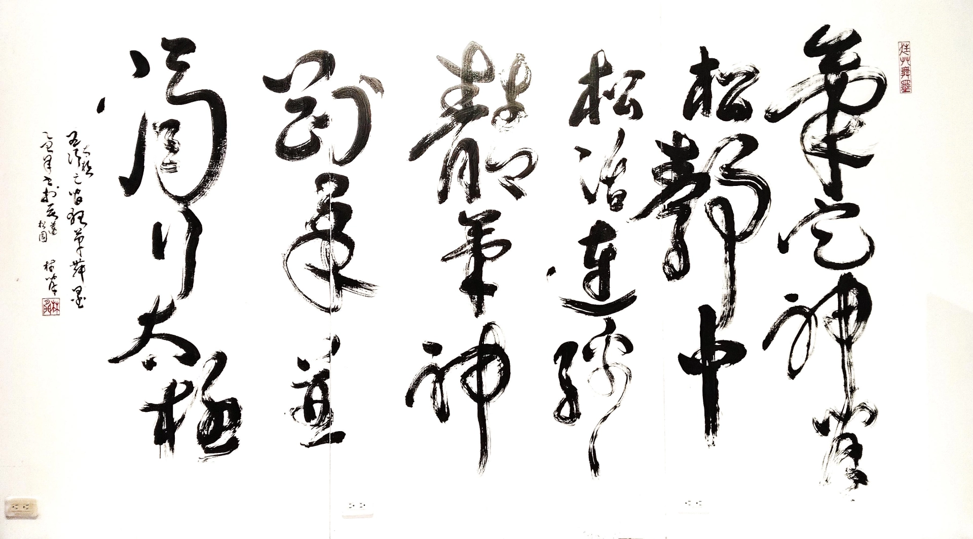 釋文:氣定神閒松靜中松活連綿靜氣神剛柔並濟行太極落款:太極五行之間狂草舞墨乙巳年書於花蓮松園林閒