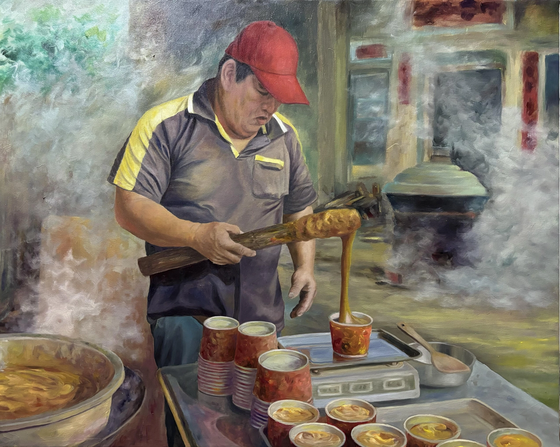 美濃過年前蒸煮年糕的景象;炊煙繚繞中,蘊藏著家族團聚與節慶期盼。甜香不只入口,更留在記憶深處,是世代