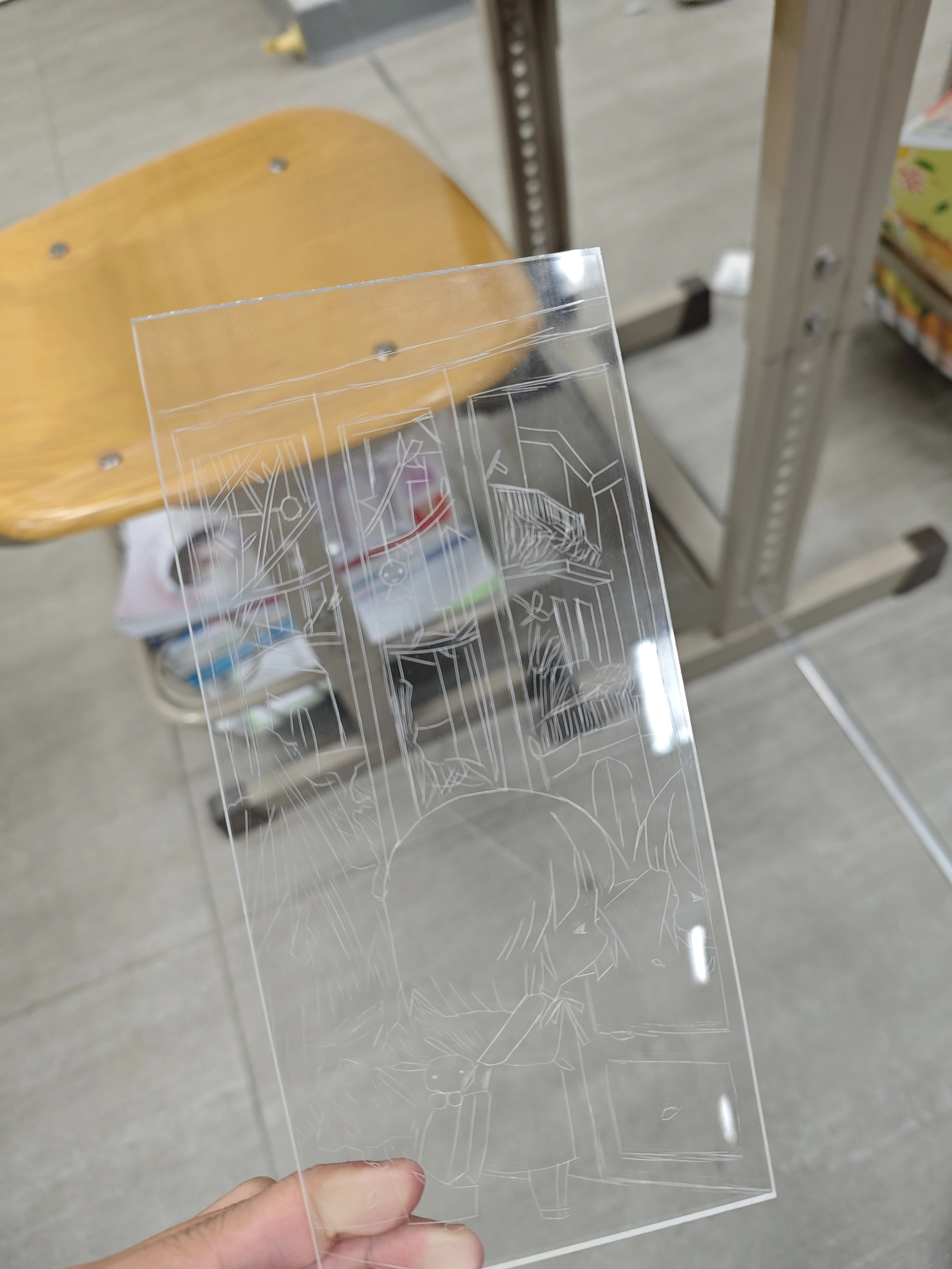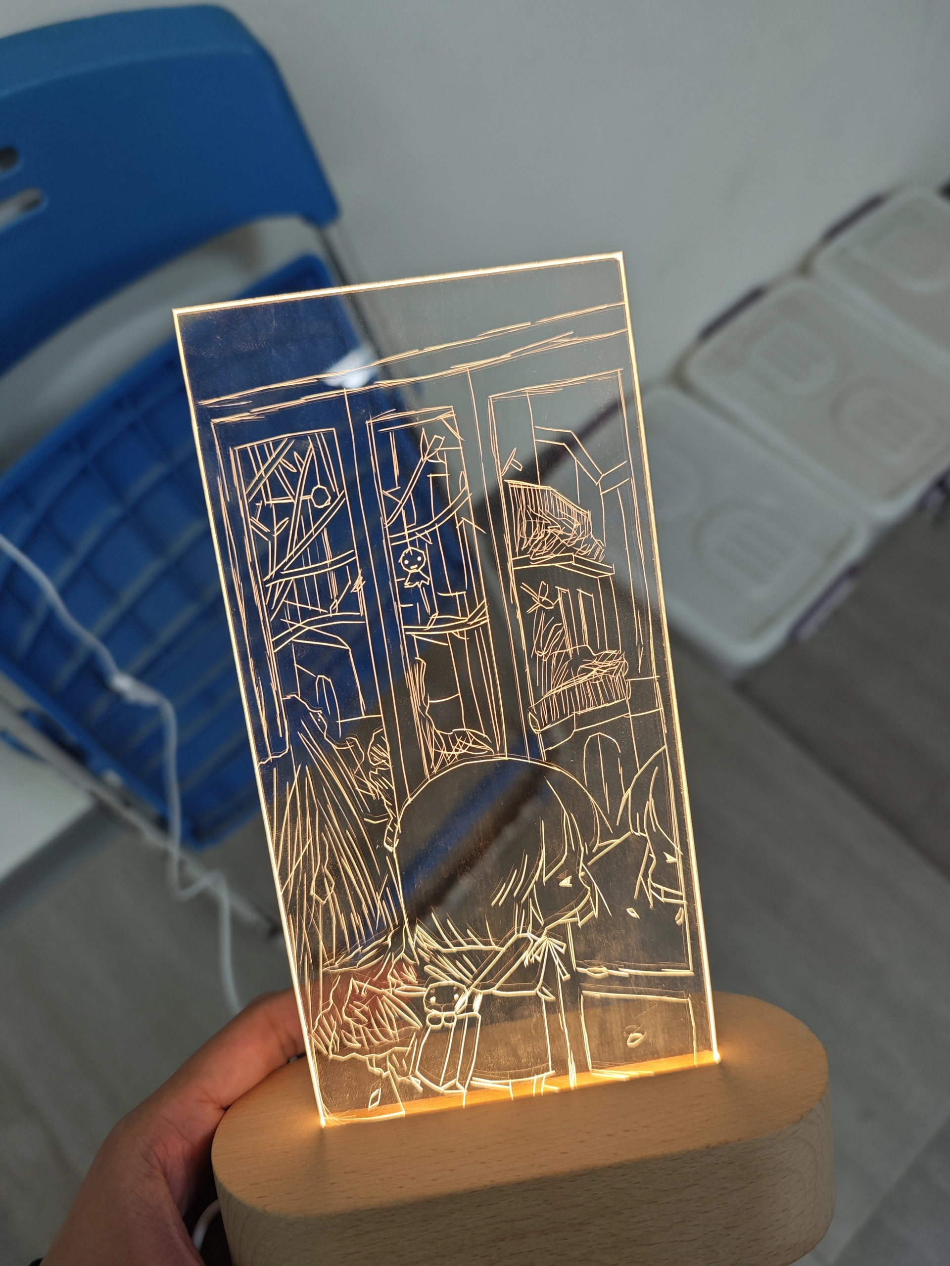 這件壓克力燈飾以手繪線條刻畫出溫馨的場景:一位小女孩在窗前凝望,周圍細節以簡潔的線描呈現,透過光線投
