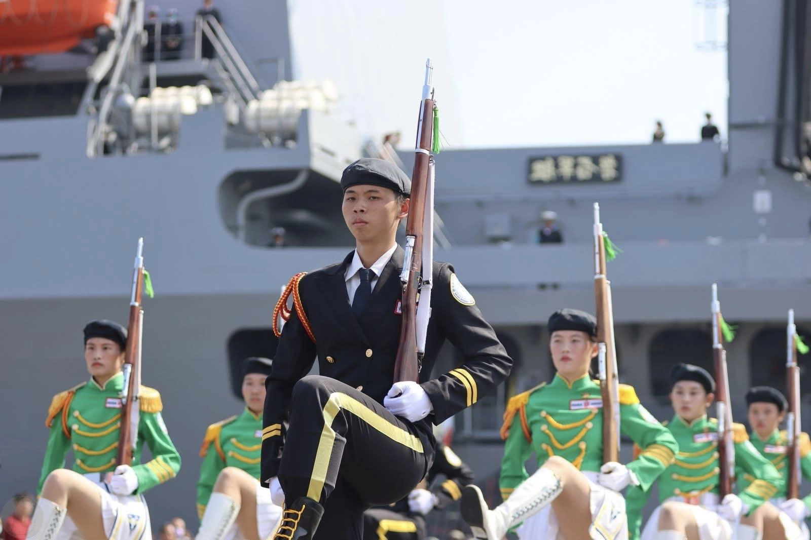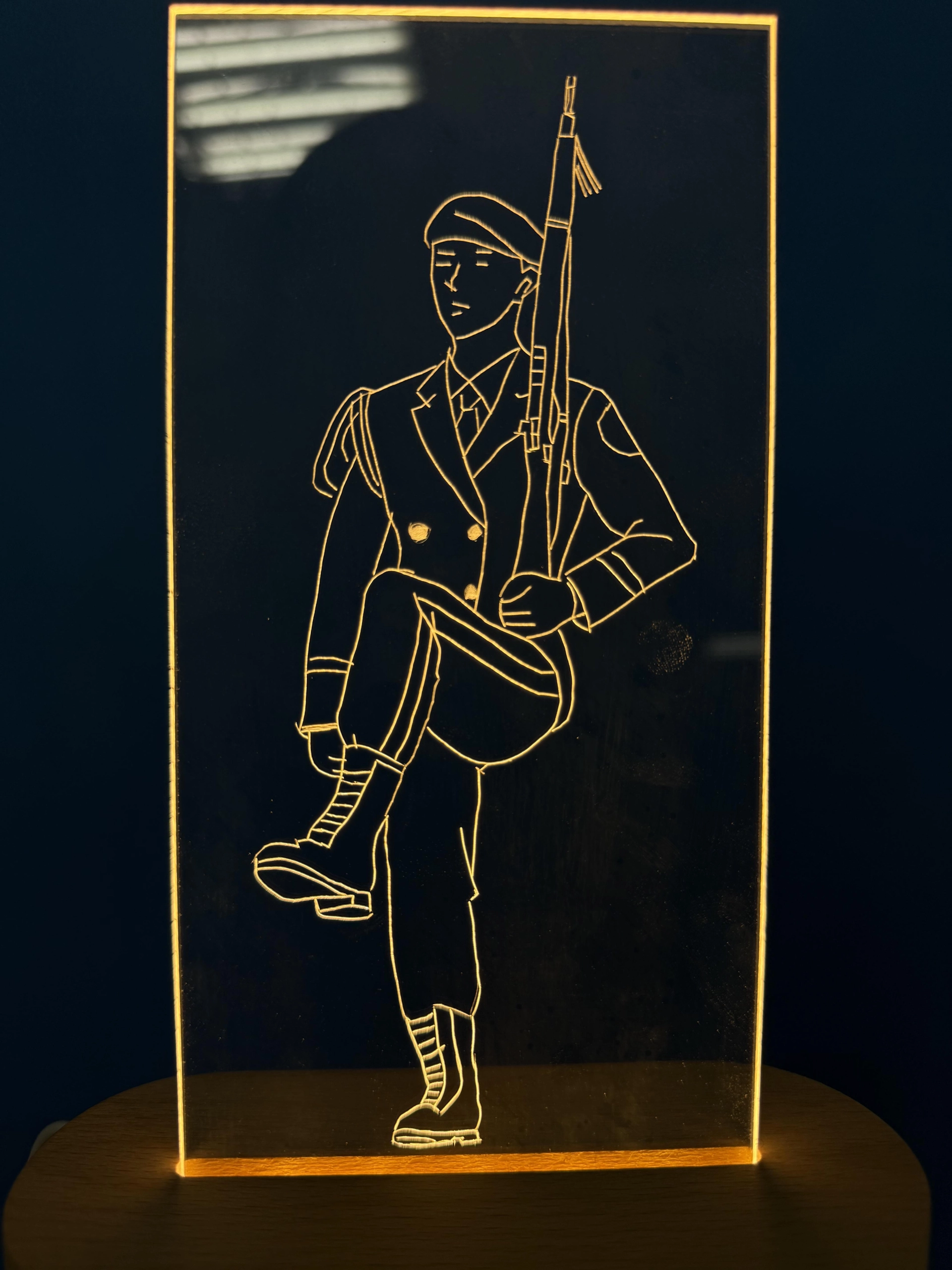 作品以我參與海軍敦睦遠航、在台南安平港開放活動中進行儀隊表演的瞬間為發想。以線條與光影記錄當時的步伐、操槍動作與儀隊的整齊節奏,也象徵訓練背後的專注與堅持。這件作品對我而言,是把那段榮耀與努力以另一種方式留下。