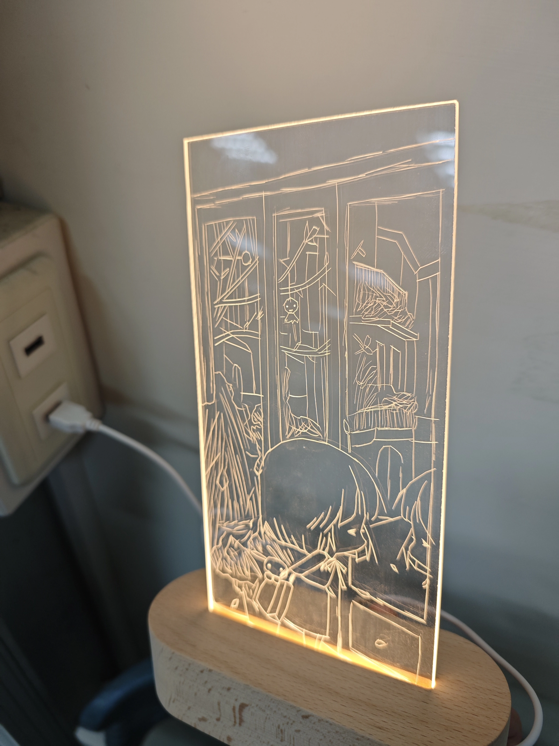 這件壓克力燈飾以手繪線條刻畫出溫馨的場景:一位小女孩在窗前凝望,周圍細節以簡潔的線描呈現,透過光線投