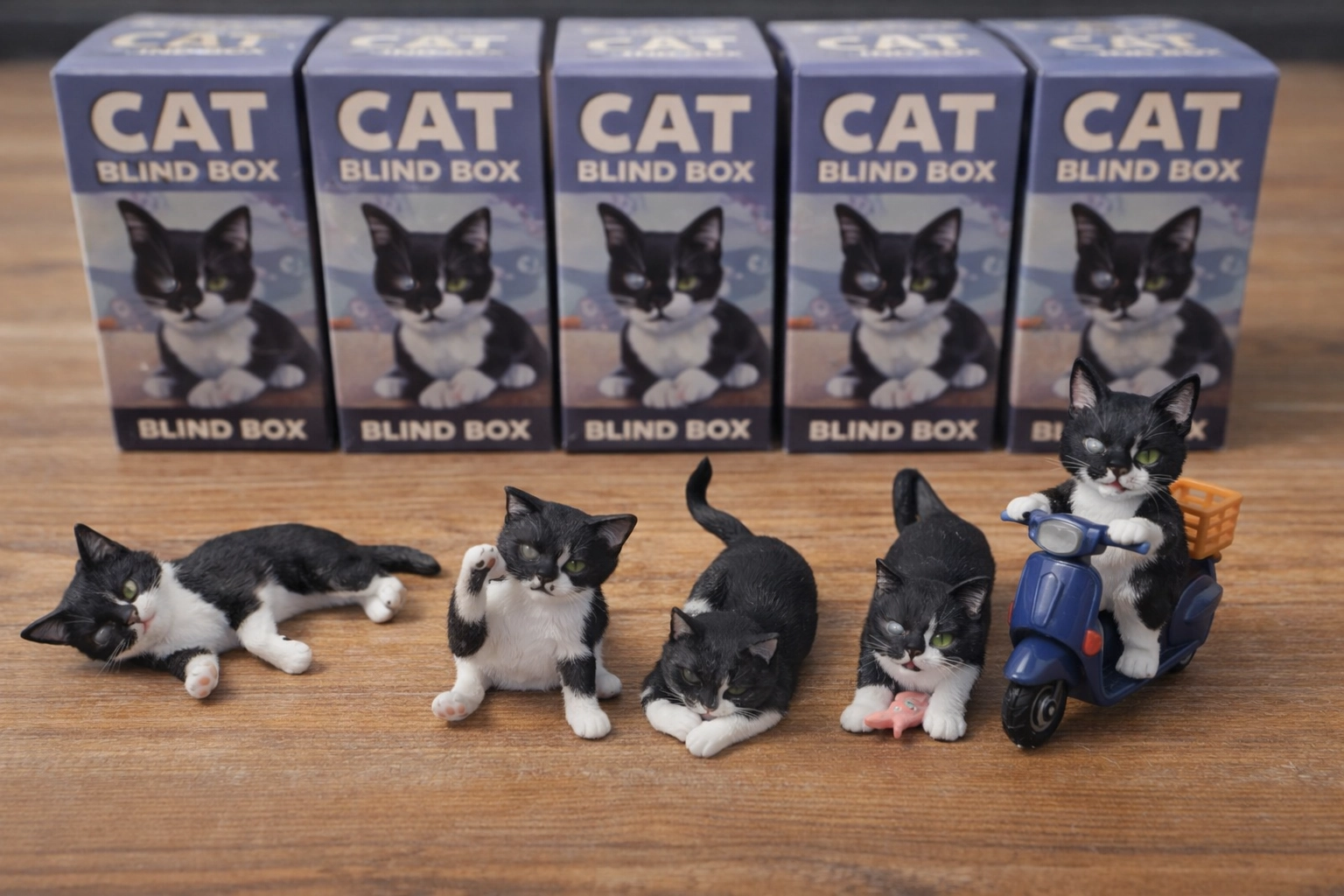 並且將這些公仔放在木頭色桌子上,後方是盲盒的盒子