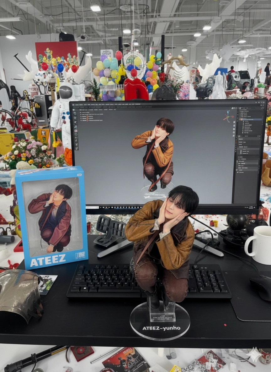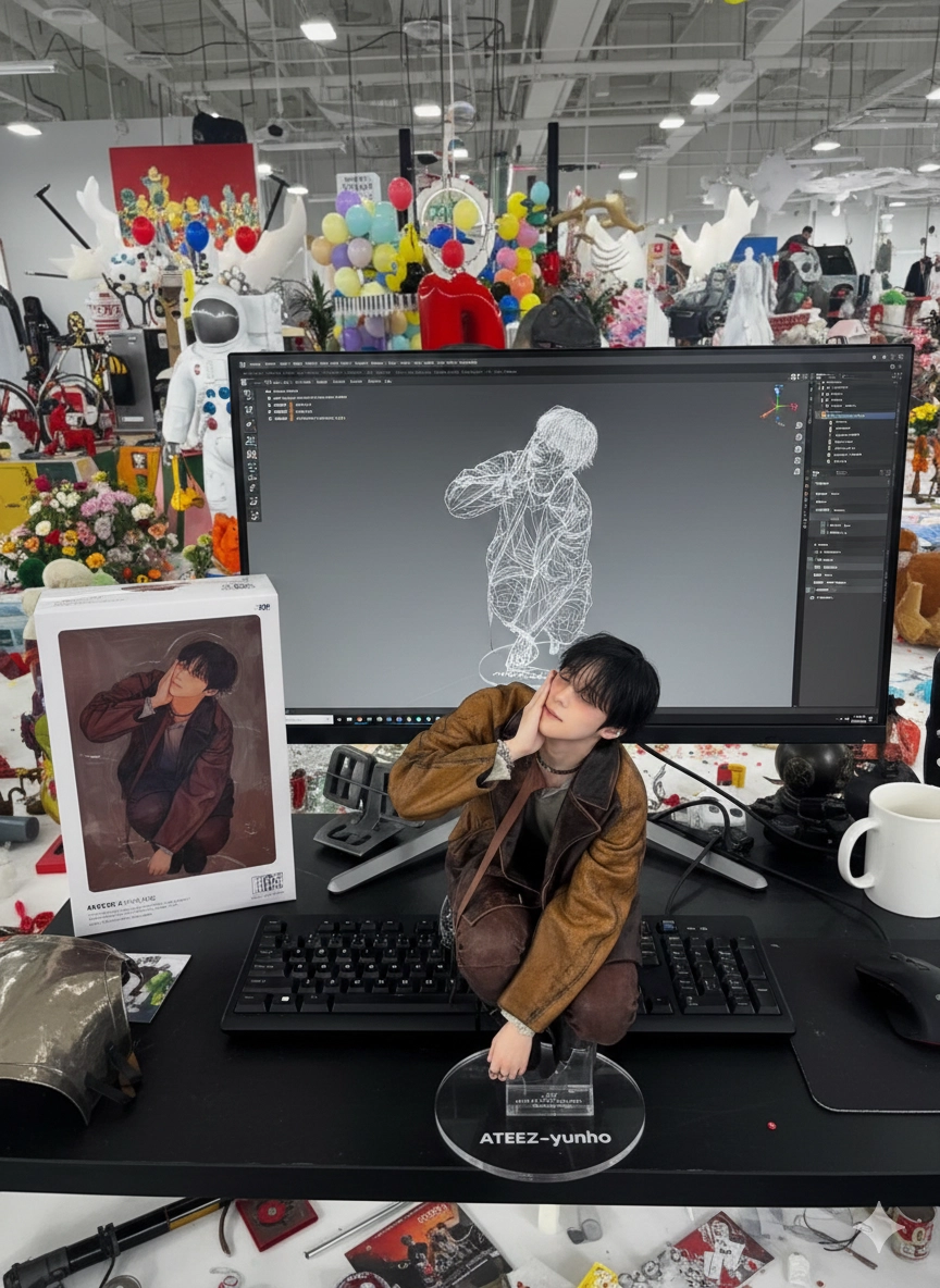 場景設定為一張電腦書桌,上面展示一個約 1/7 比例的 PVC 公仔。角色採蹲姿,動作改成雙手捧臉,並且在電腦、模型盒內都需要做更改,固定在透明的圓形底座上,底座標示「ATEEZ - Yunho」,整體呈現精緻、擬真且具收藏價值的動漫風格,並融入 DIESEL 時裝週的氛圍。