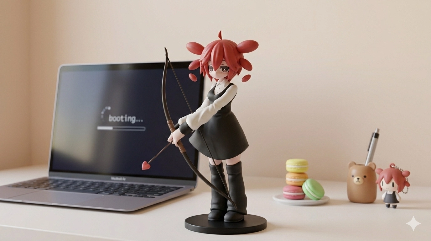 幫我把這張圖的人物提取出來,去掉背景,以單獨的人物模型並抱持同樣的的動作轉成3d公仔的樣子站在電腦桌
