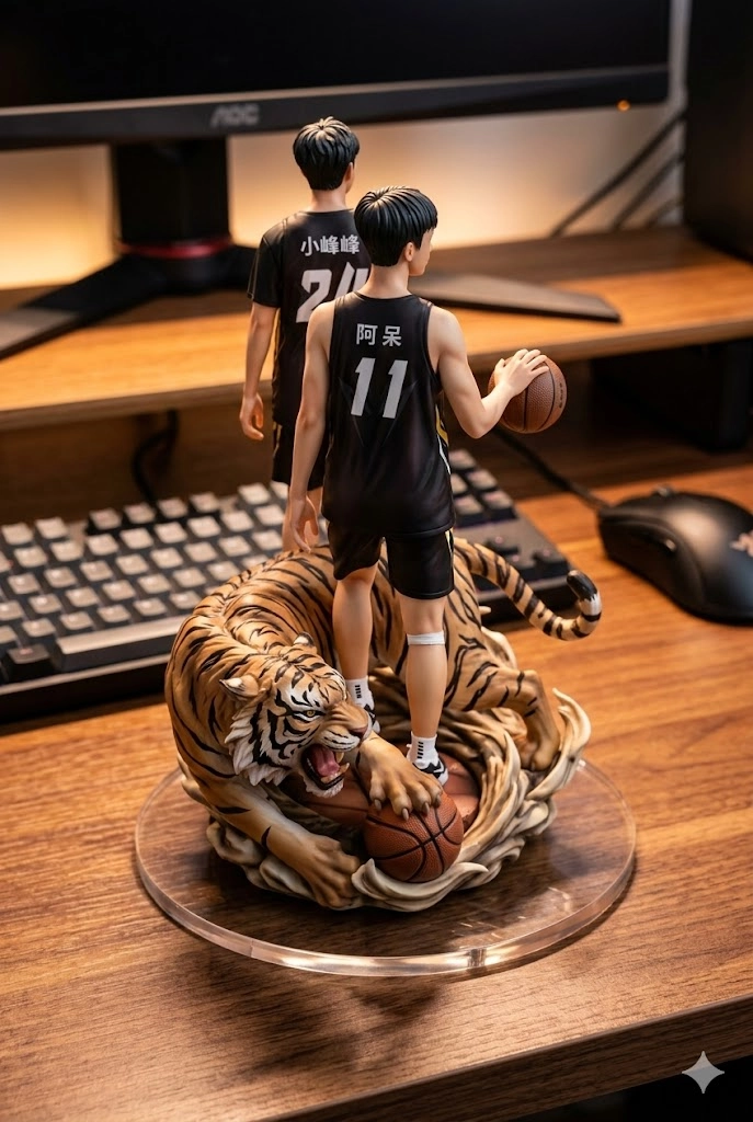 請用我提供的原圖,把圖片內主體變成電腦桌前的立體公仔。