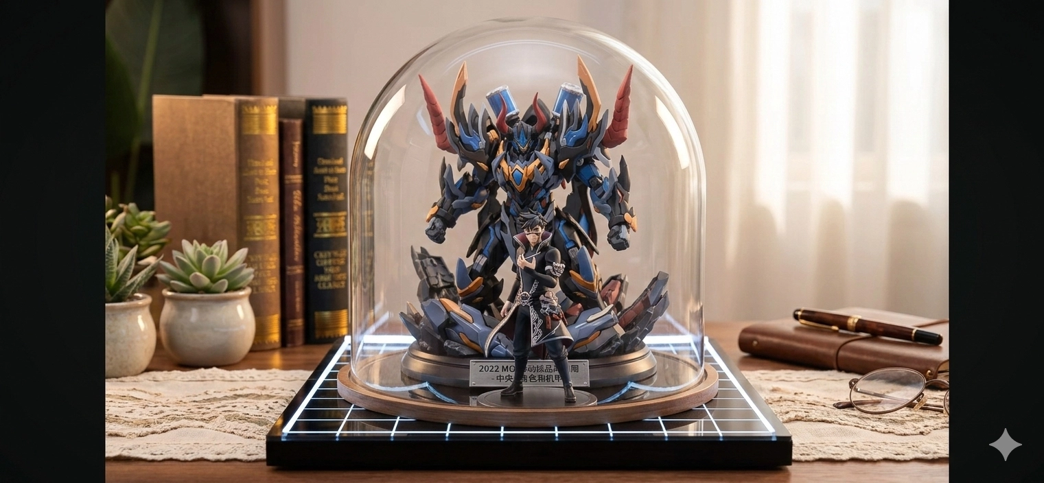 幫我把最中間的那一個角色生成一隻公仔背景的機甲也把它生成為公仔放在一張黑色的桌子上幫我用一個玻璃罩把