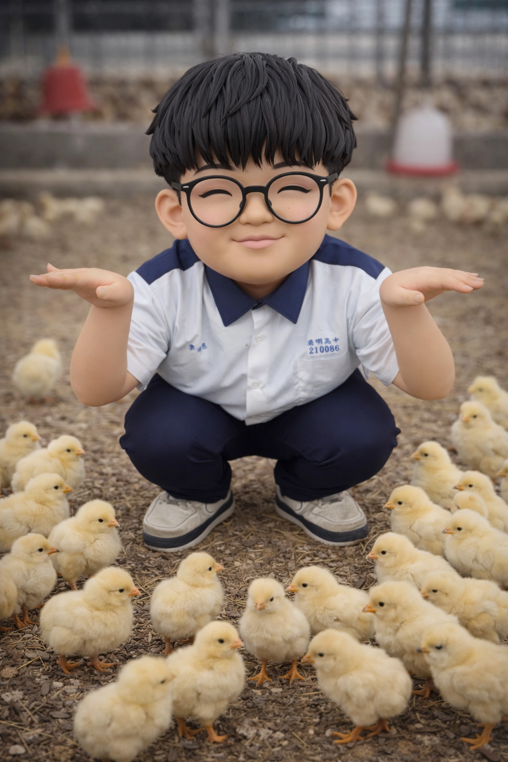 幫我把背景改成養雞場把其他的人的腳去掉在中間那個人周圍放一群小雞再幫我把中間那個人做成公仔動作不要變
