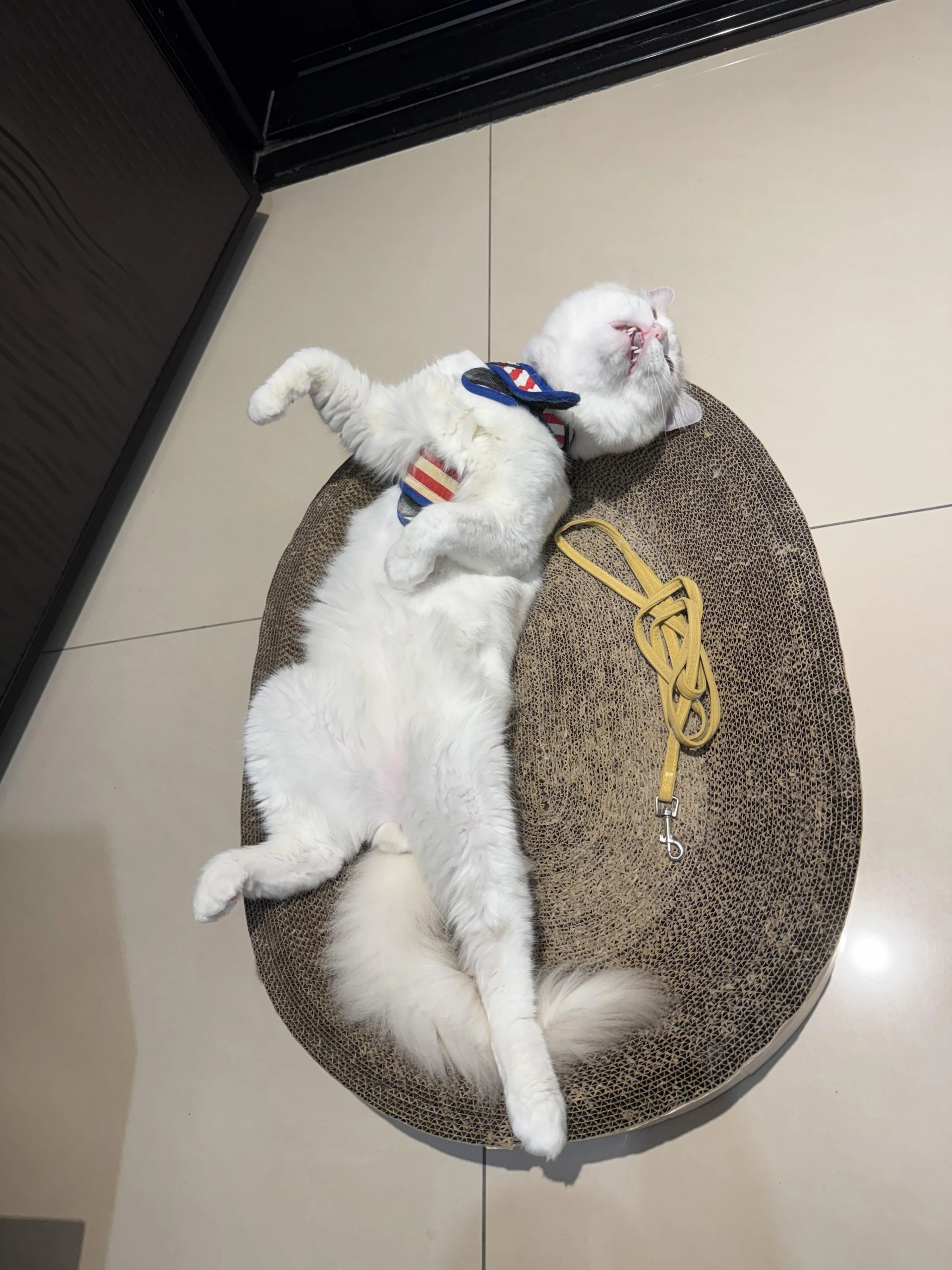 A life-size, museum-quality, highly detailed realistic resin statue of the large, fluffy, entirely white Ragdoll cat seen in image_0.png. The statue meticulously replicates the cat's extremely relaxed pose: lying on its back, completely stretched out, belly up, with both back legs fully extended and paws spread. The front paws are curled near its chest. The head is tilted back with the mouth slightly open, revealing teeth and eyes closed as if in deep sleep. Every strand of the cat's long, thick white fur texture is sculpted with precision. The specific sailor-style collar/harness (navy with red-and-white striped section) on its neck is faithfully replicated. Next to the cat on the sculpted base (which perfectly mimics the texture of the oval corrugated cardboard scratcher bed) lies the coiled yellow leather leash with its metal clasp. The statue is made of high-grade resin with a hand-painted matte finish to simulate realistic textures. Studio lighting, soft and even, highlighting every detail. High-resolution (8k), macro photography style with shallow depth of field, set against a soft-focus background of the original tiled floor. ::3 for realistic eyes depth, ::3 for fur texture detail.