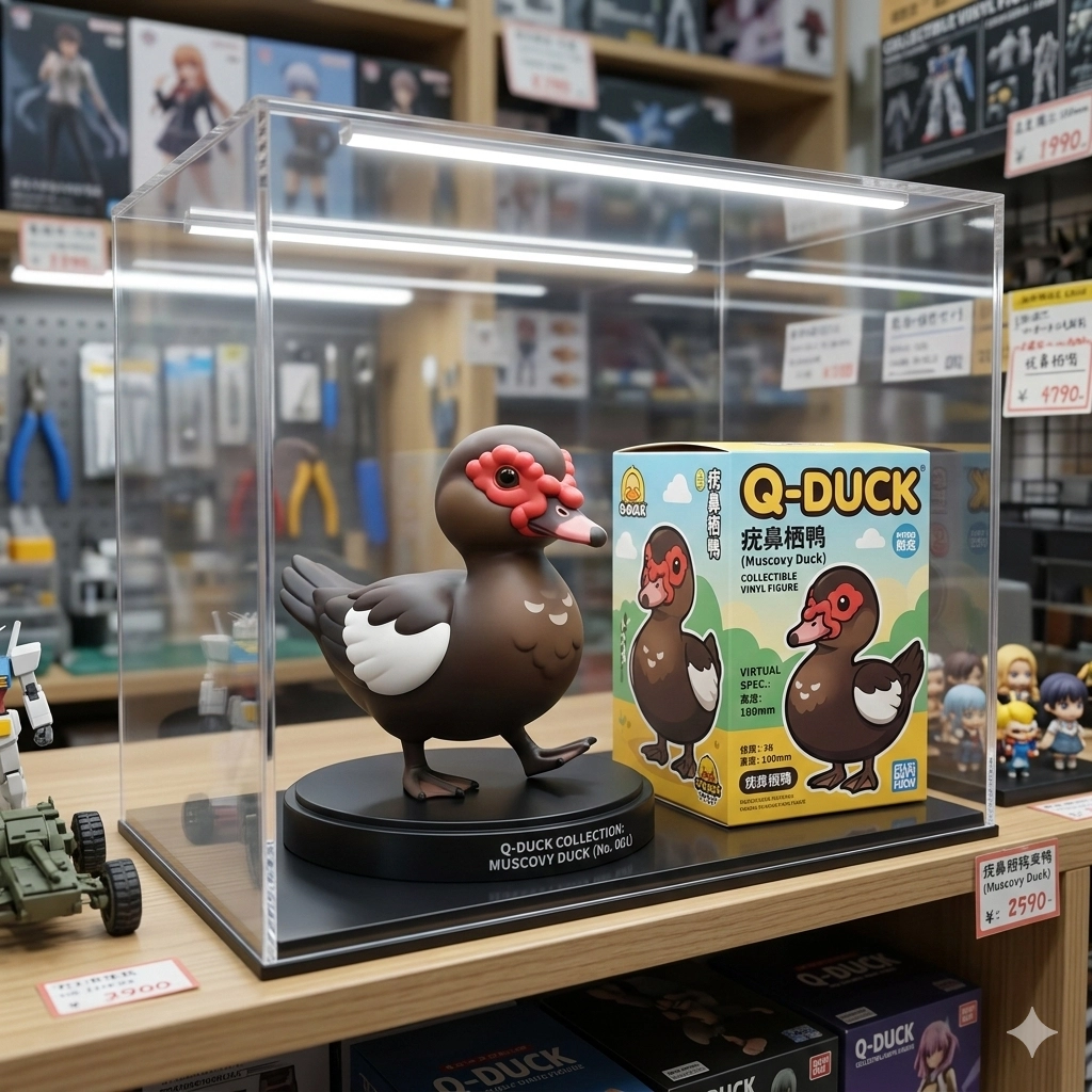 請幫我設計一張Q版公仔圖片鴨子腳下具有塑膠底座放在展示箱中旁邊有鴨子的盒子以模型店作為背景