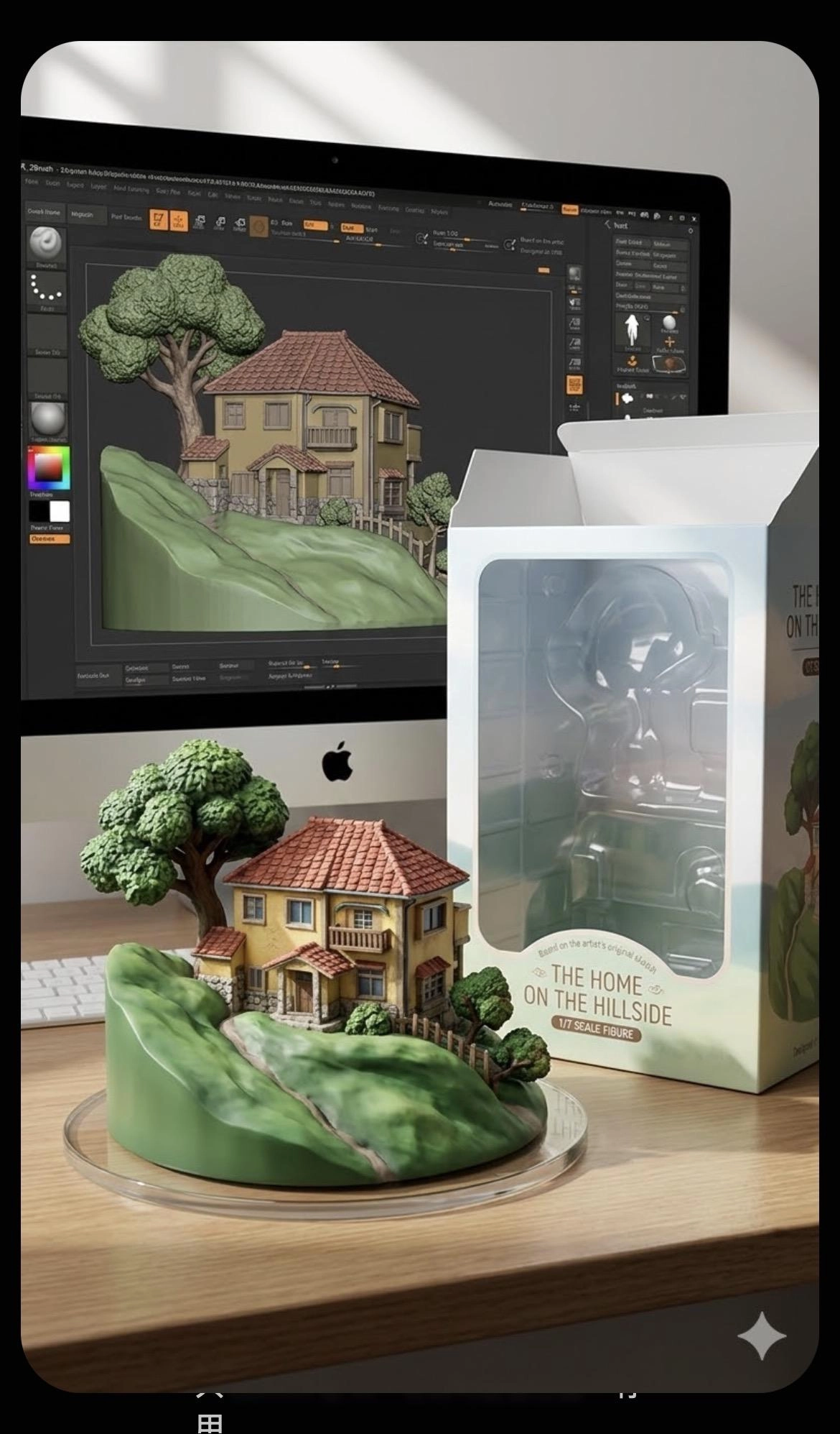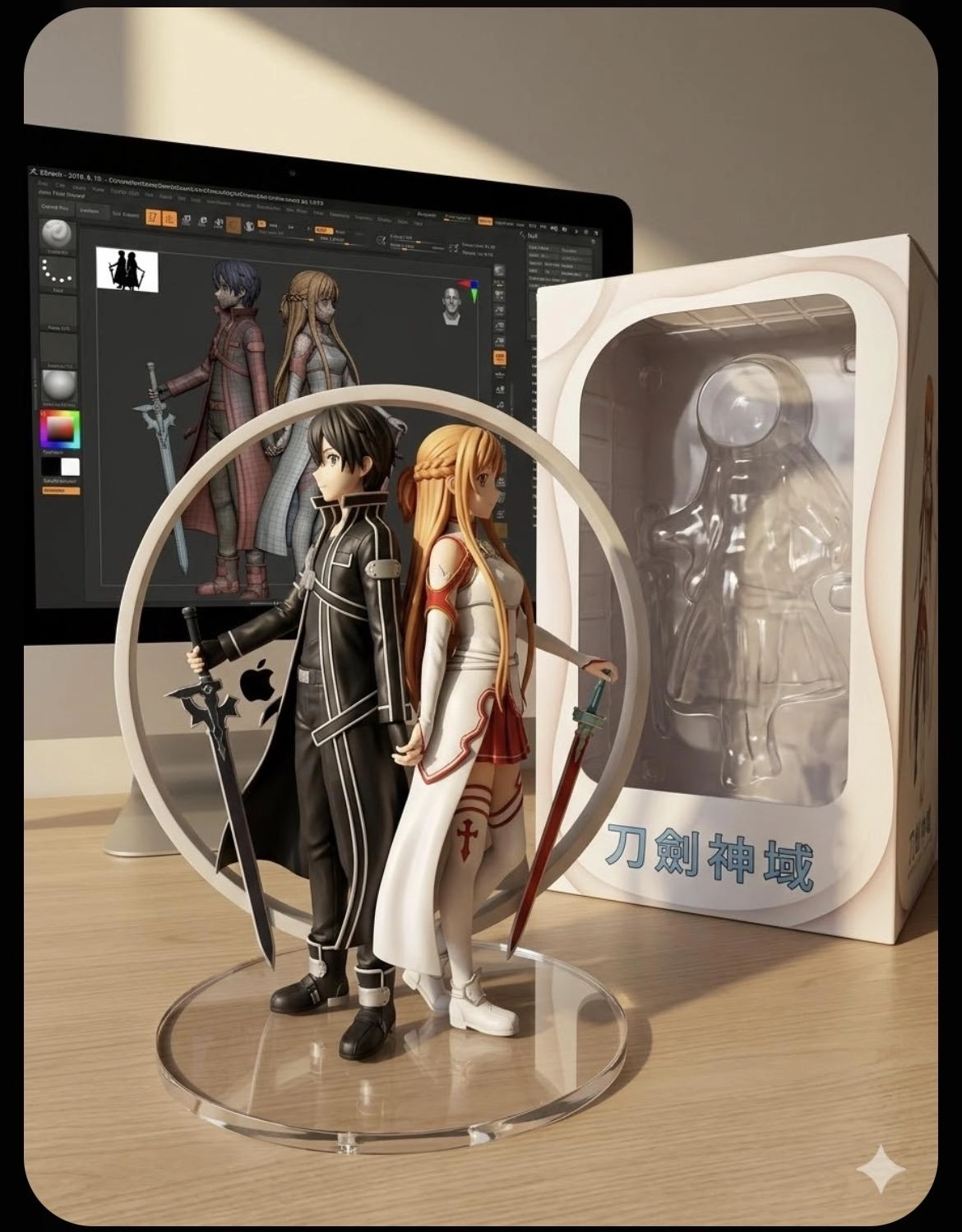 Imagine a realistic 1/7 scale figure of the characters shown, presented as if it were a finished commercial product. It’s displayed on top of a Mac desk, anchored by a clean, round acrylic base without any labels. A stream of elegant light falls across the figure, bringing out the sculpted details. On the Mac screen behind it, the ongoing ZBrush creation process of this figure is visible.