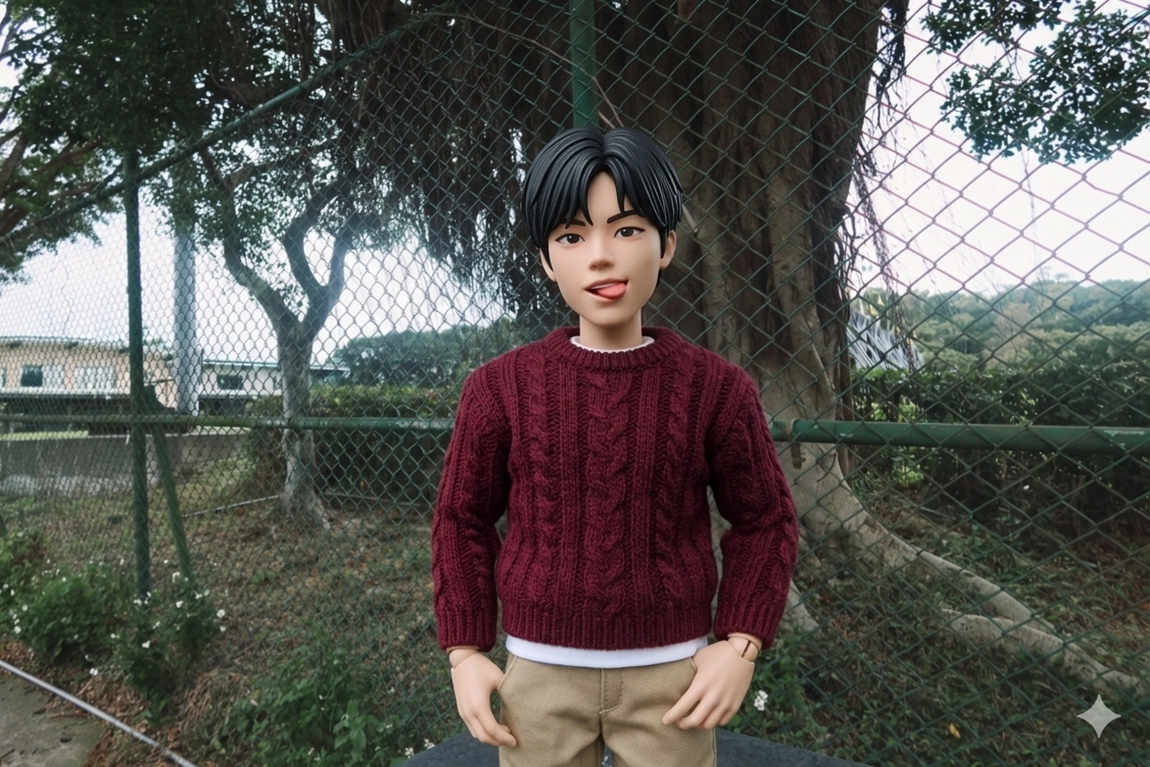 幫我生成公仔圖像衣服換成酒紅針織毛衣頭髮染成黑色