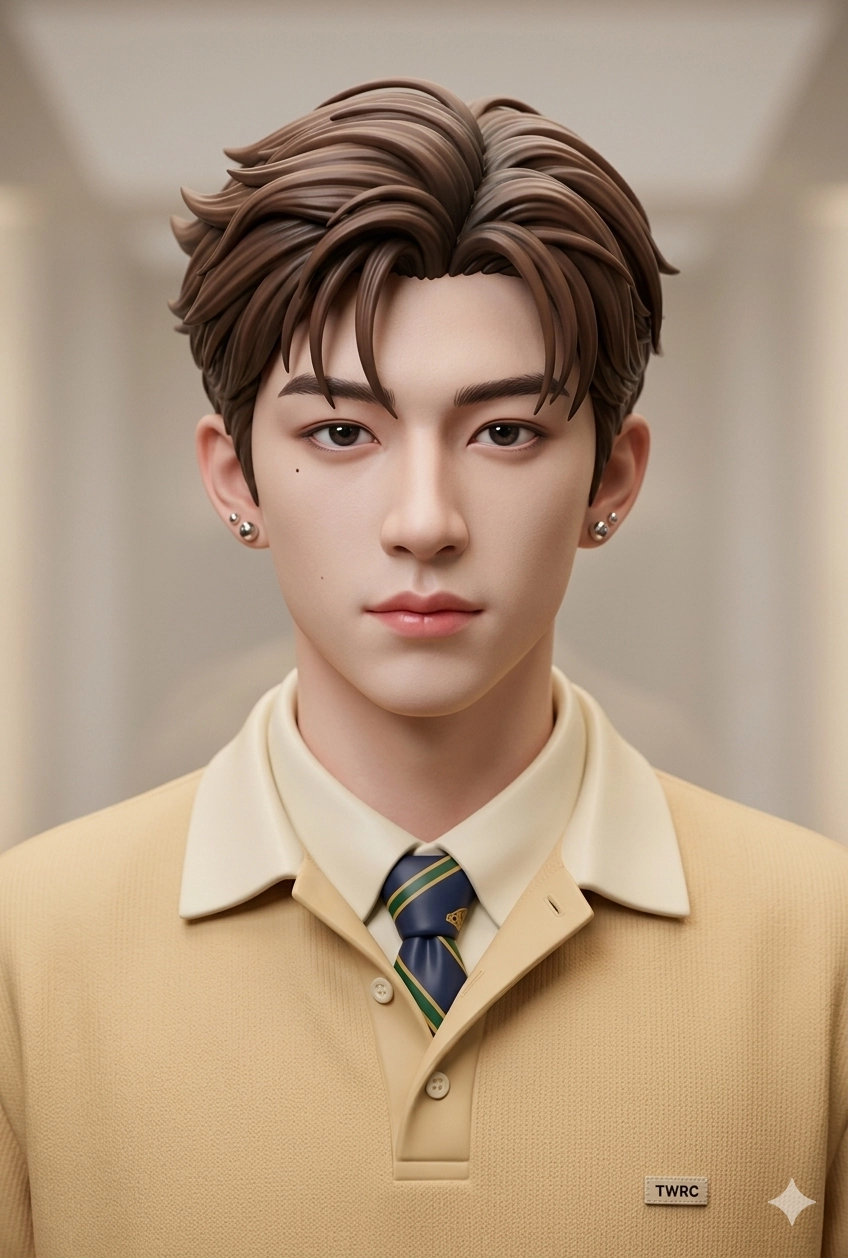 幫我生成一個公仔圖像讓他不要穿這件最外層的風衣讓他戴耳釘