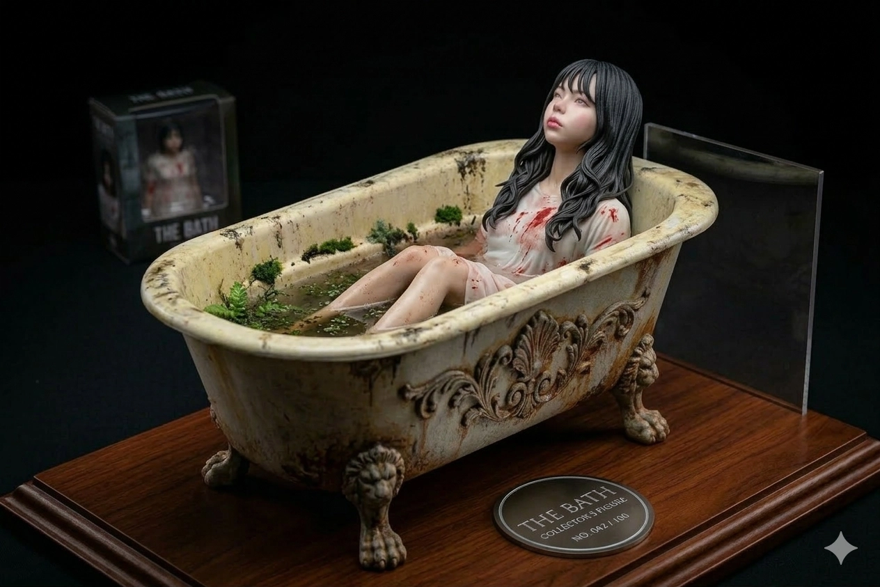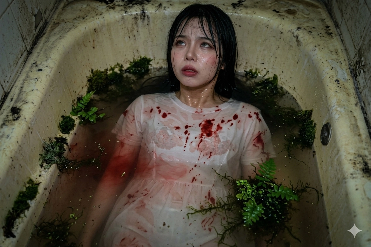 我請AI幫我把衣服換成稍微淋濕的白色帶血洋裝,背景換成潮濕髒污的浴缸,人泡在水裡眼神失焦的模型,人坐著 上半身沒有在水裡 ,但水裡跟浴缸上有一點青苔帶著一點生機