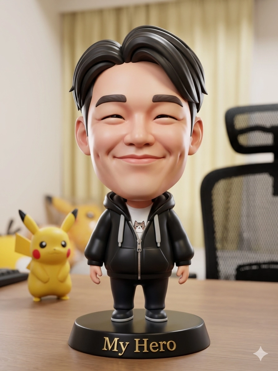 一張高品質的 3D 渲染圖,主角是一個可愛的個人化大頭公仔。比例上頭部誇張地大,身體小巧(Q版/Chibi 風格)。公仔特徵:[短碎黑髮、戴圓框眼鏡]、表情 [自信且帶著露齒的微笑]。穿著 [一件印有貓咪圖案的白色 T-shirt、藍色牛仔褲與白色運動鞋]。公仔站在一個圓形的黑色塑膠底座上,底座上刻有 [My Hero] 的字樣。整體風格類似可收藏的限量版盲盒公仔,材質呈現光滑的樹脂感,色調鮮艷明亮。背景是模糊的現代書桌場景,採光柔和,具有電影感的景深效果。」