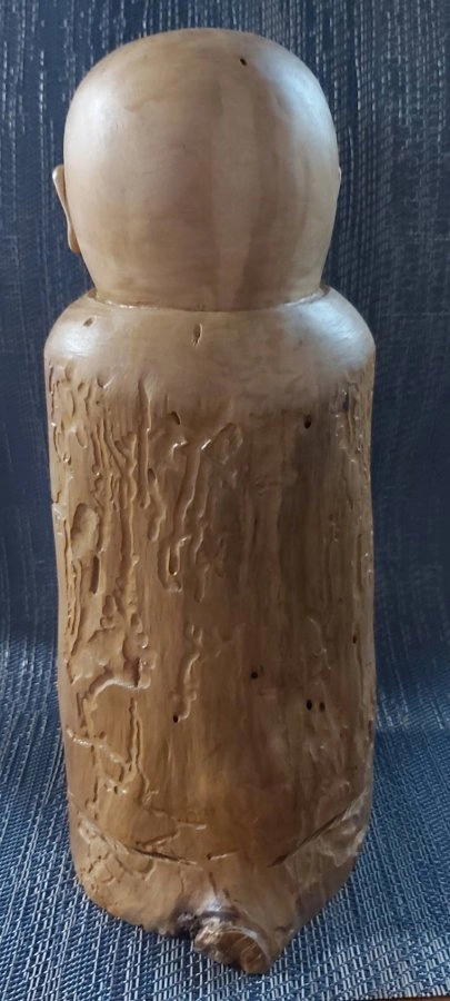 白楊木刻。原木已受歲月與白蟻部分侵蝕,但也巧妙的化為自然的紋理圖飾,正可以呼應人生體會。名曰「禮敬」