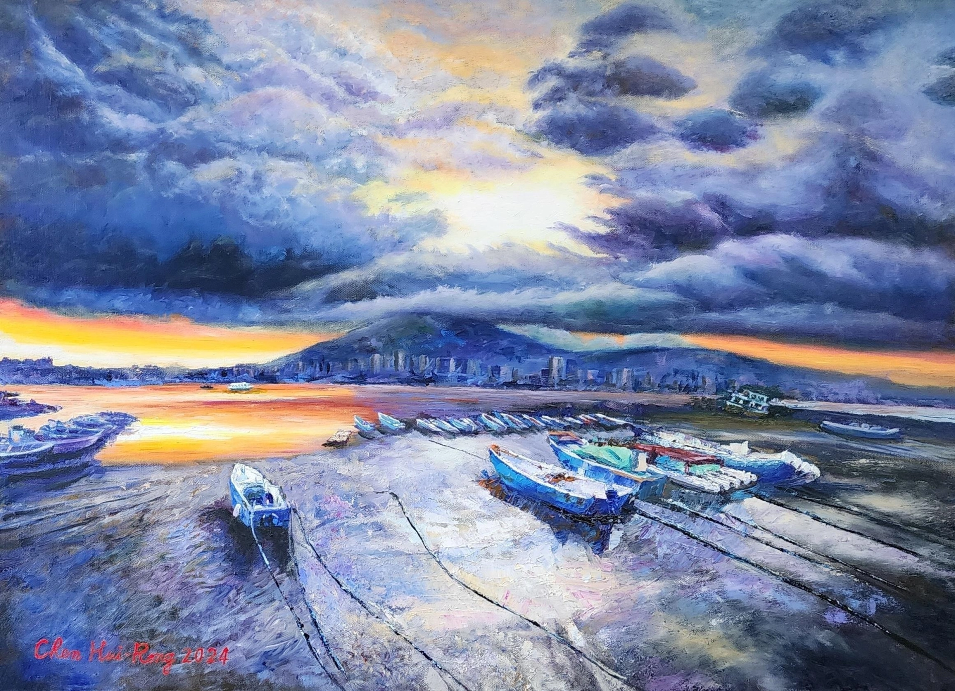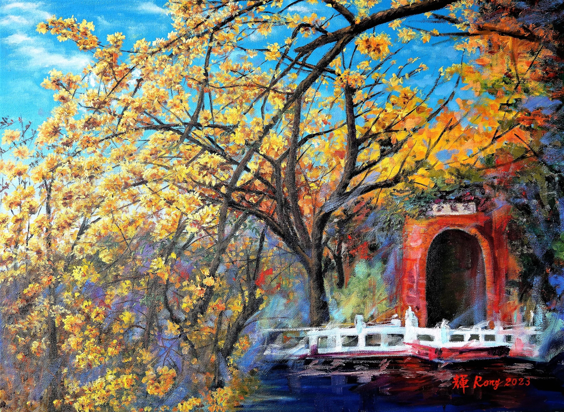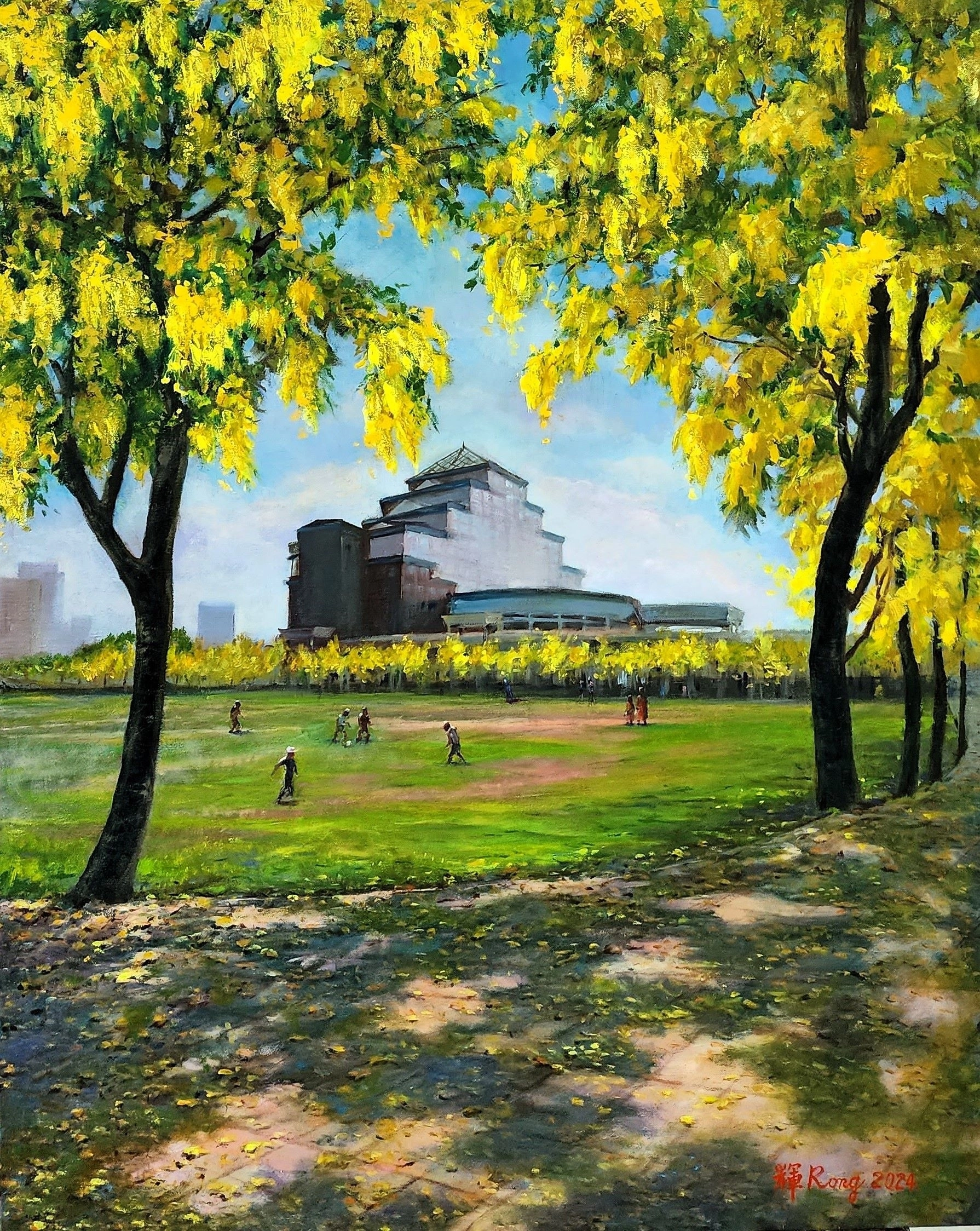 作品說明:阿勃勒盛開時,寫生永華市政府景觀,發現觸目景致美極了!遠景市政大樓磐石地標雄偉壯觀,拉近迴