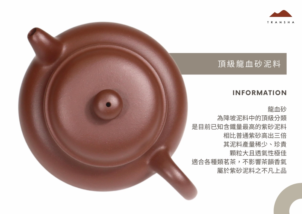 【說明】: 龍血砂為降坡泥料中的頂級分類,是目前已知含鐵量最高的紫砂泥料,