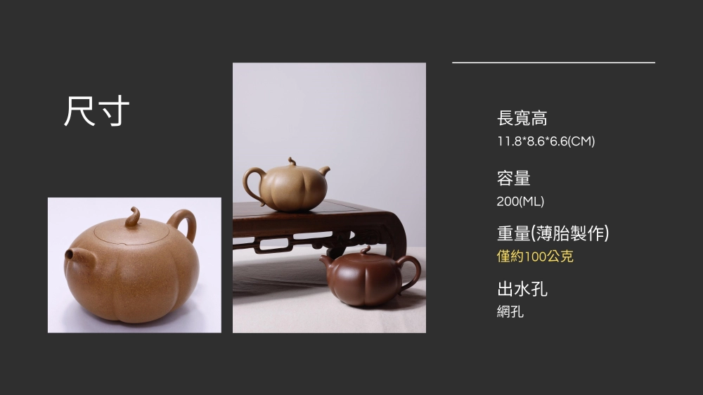 【品名】:紫泥素心南瓜壺【泥料】:宜興老紫泥【規格】:11.8*8.6*6.6(cm)【容量】:20