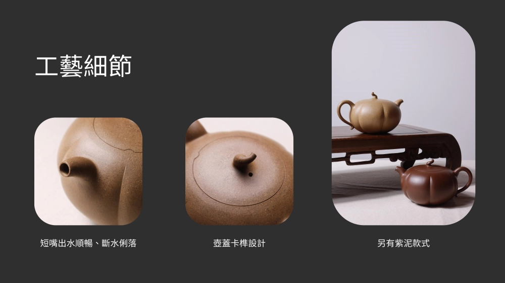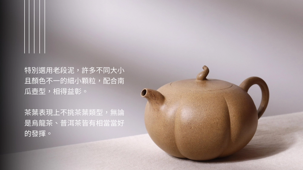 選用老段泥製作,許多不同大小且顏色不一的細小顆粒,配合南瓜壺形相得益彰。