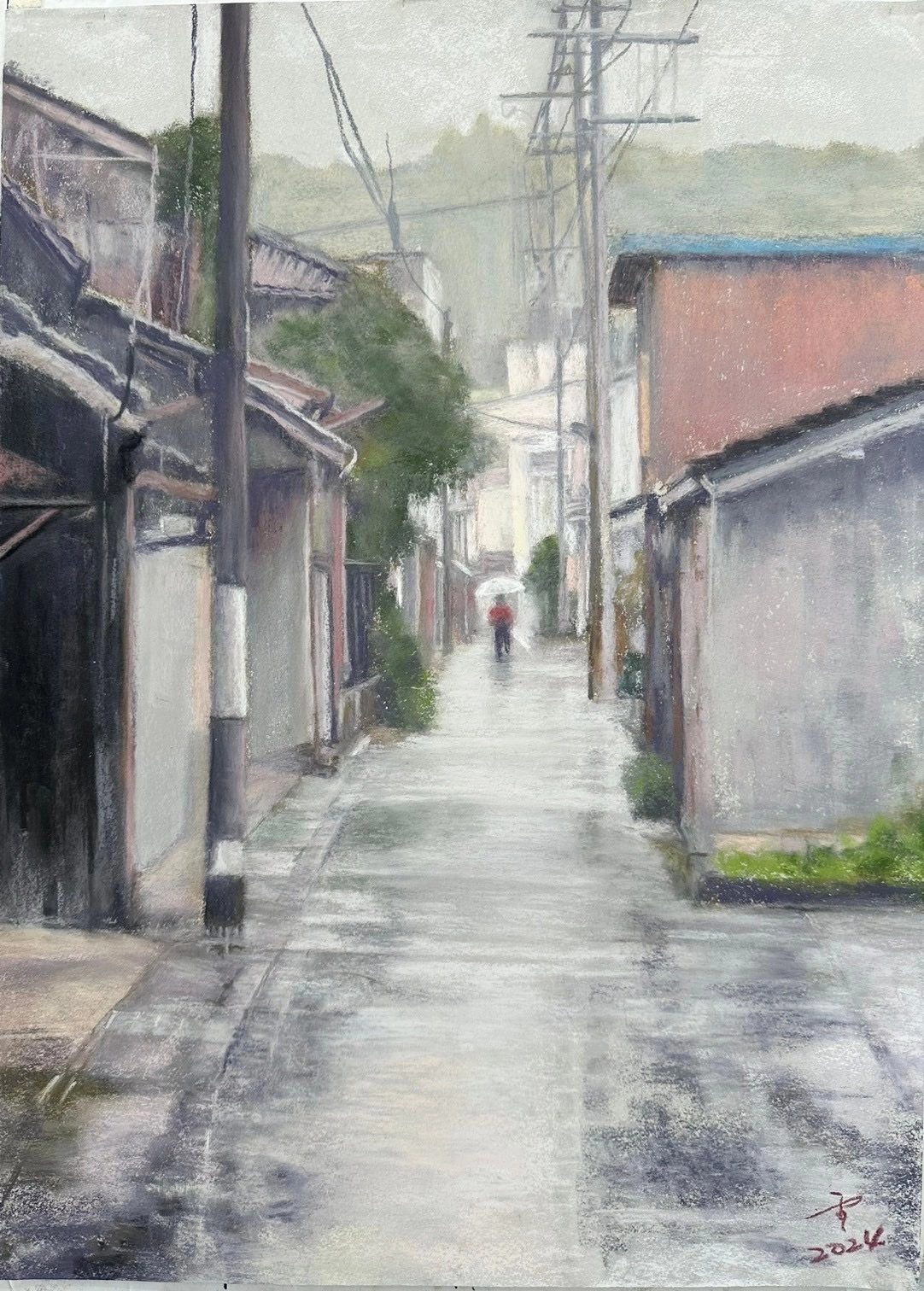 蕭瑟街道,連街角都顯得模糊不清,孤獨撐傘走在巷弄的人兒,天空中飄著不只是雨,還瀰漫著幾許的憂傷與惆悵