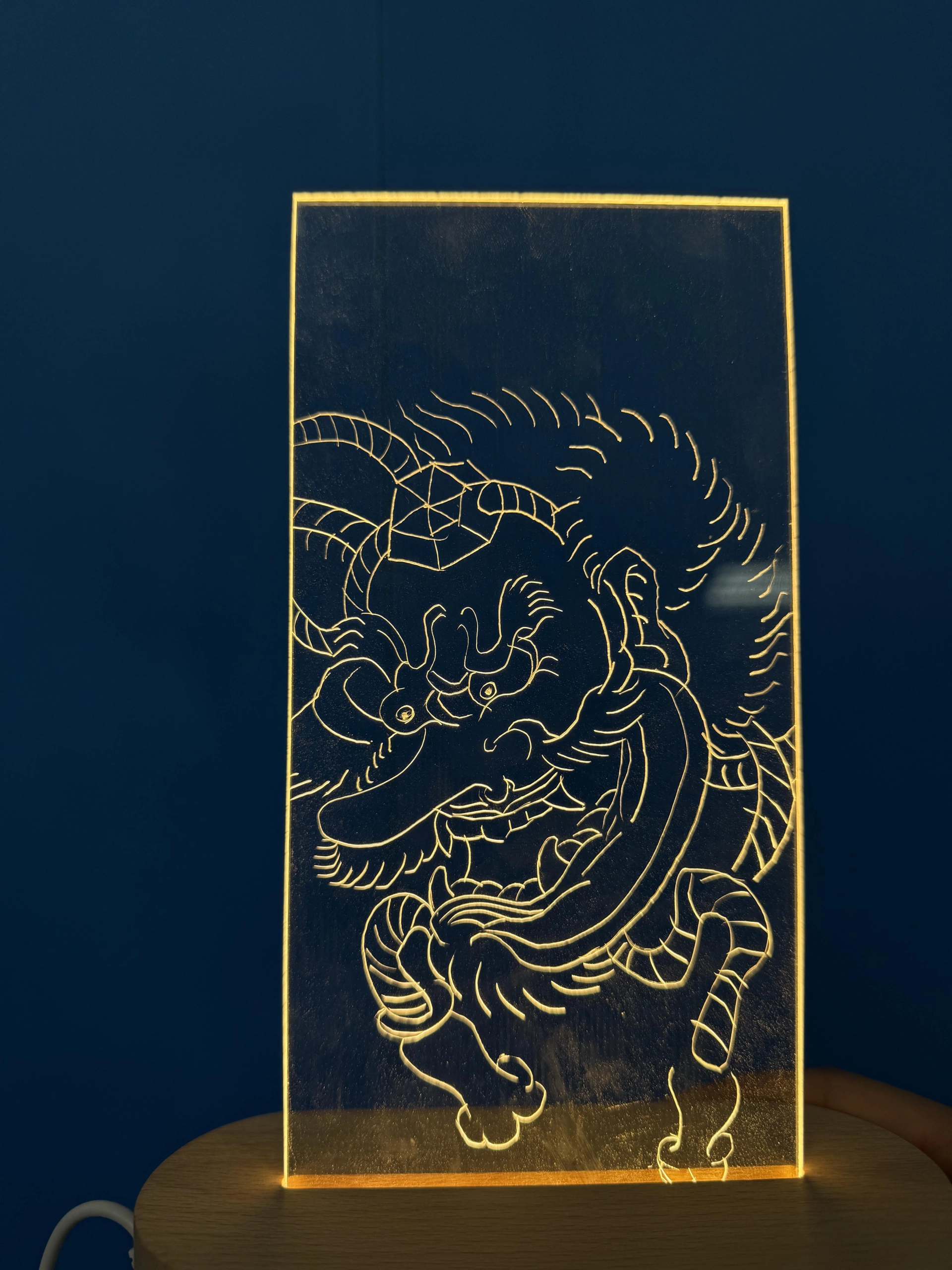 作品以天狗形象為主題,靈感源自作者對廟會文化的熱愛。以俐落線條刻畫出神祇威猛而靈動的姿態,呈現傳統信