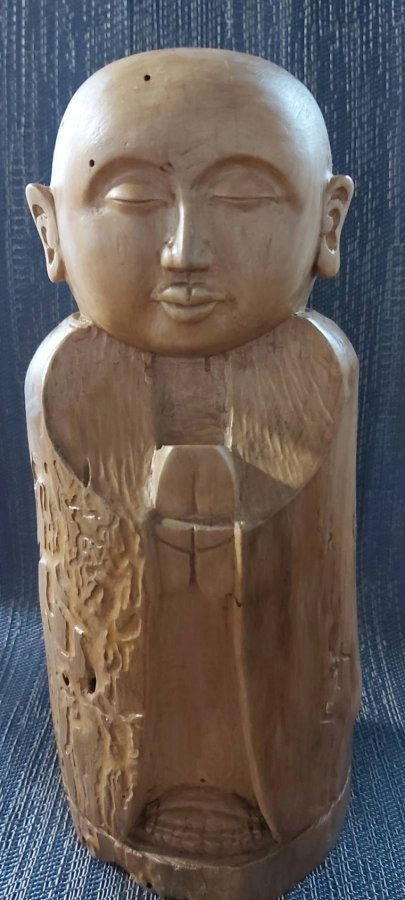 白楊木刻。原木已受歲月與白蟻部分侵蝕,但也巧妙的化為自然的紋理圖飾,正可以呼應人生體會。名曰「禮敬」