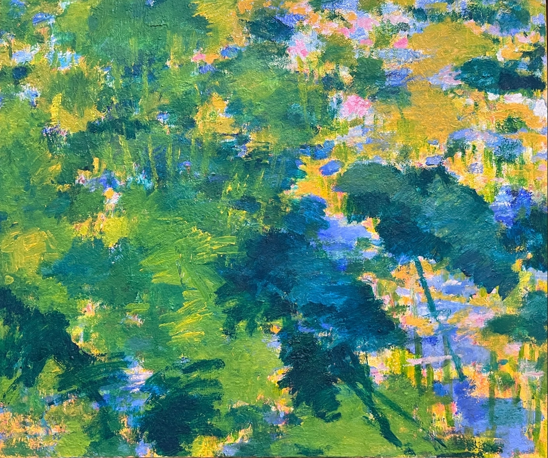 創作理念說明:有光的空間,一定會充滿氣息,在油畫面裏頭的水花光影,以鮮明色彩傳達清涼悠活的花池。夏日