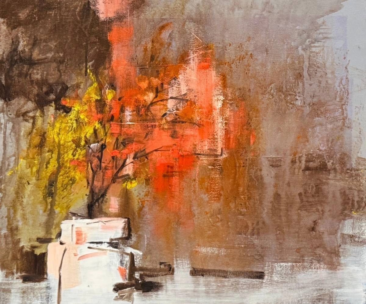 飛花(油畫62×51cm2025)先是大塊大塊的舖灑然後一條一條的直的橫的曲的線再來一點一點的滴落彈