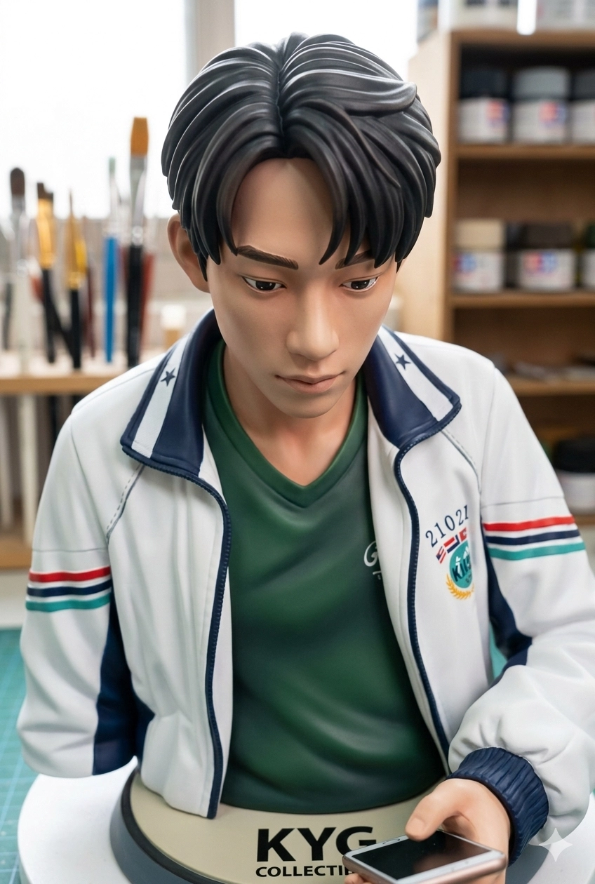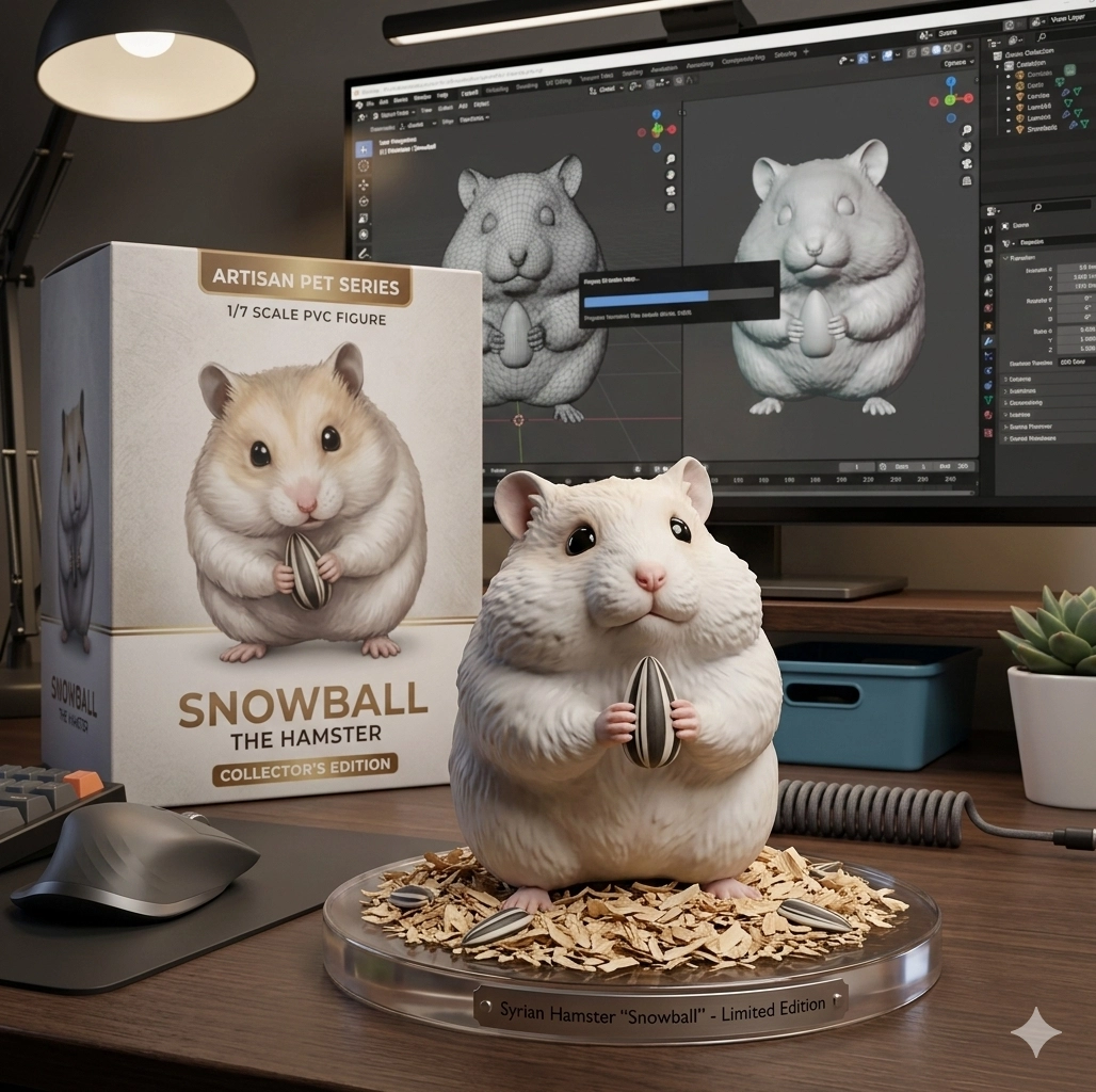 請用我提供的原圖,把圖片內主體變成電腦桌前的立體公仔。場景為一張電腦書桌,上面擺放著一個1/7比例的