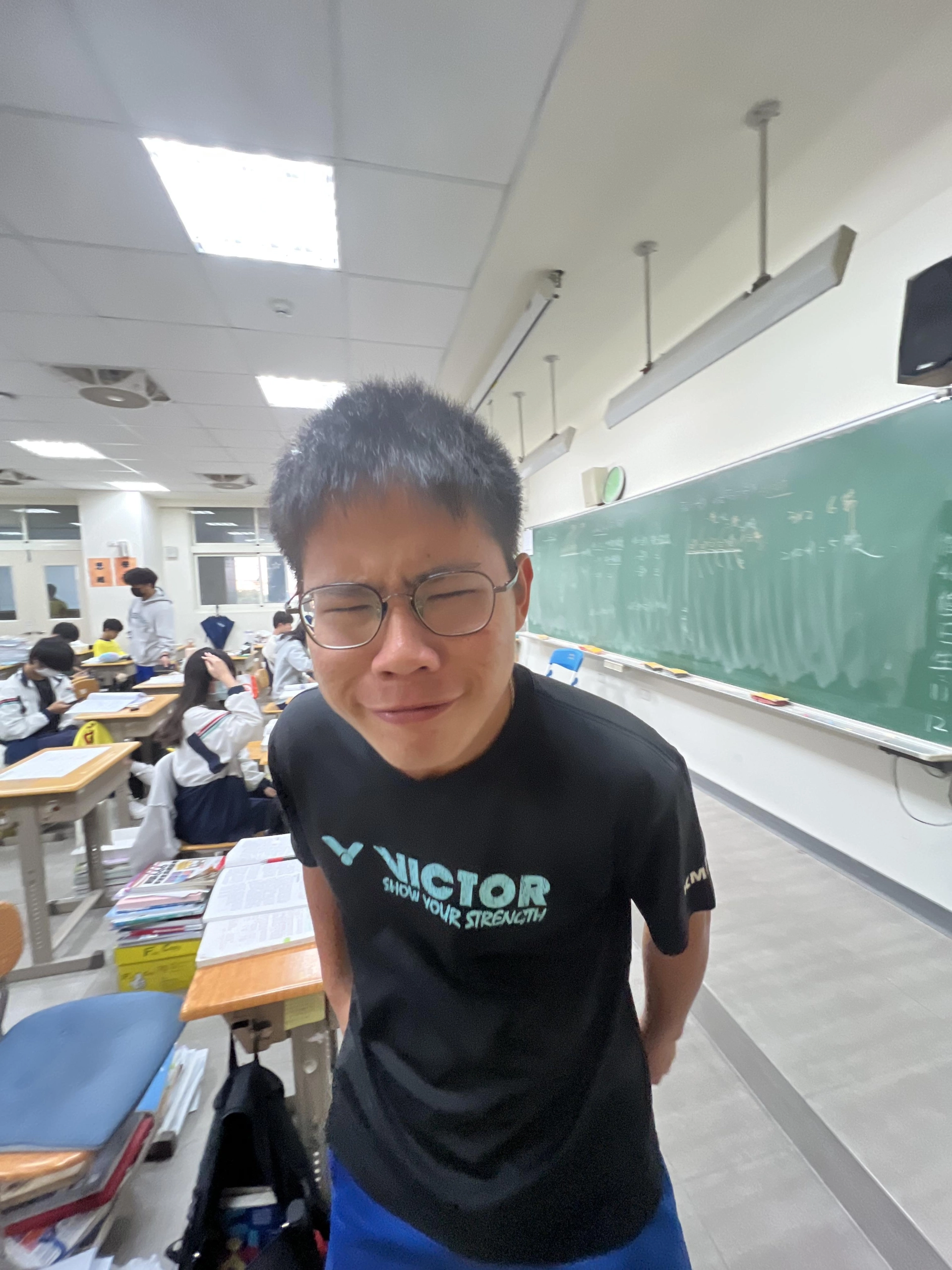請使用我提供的原始照片作為人物參考,保留角色的臉型比例、短平頭髮型、黑框圓眼鏡以及瞇眼搞笑的表情特徵