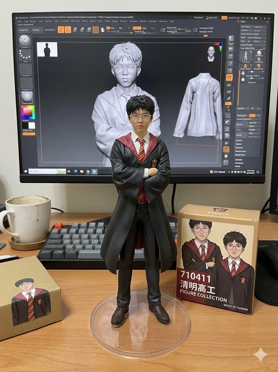 本作品以提供的人物照片為基礎,將真實人物轉化為一尊具有立體感的桌面公仔。公仔保留了原本的學生制服元素