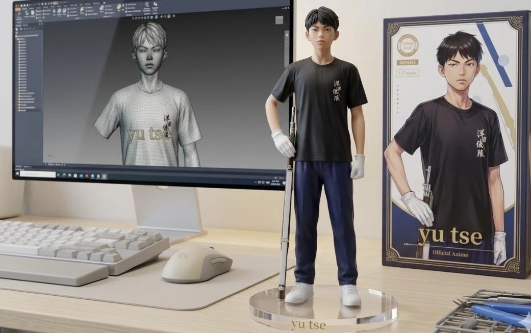 請用我提供的原圖,把圖片內主體變成電腦桌前的立體公仔。場景為一張電腦書桌,上面擺放著一個1/7比例的